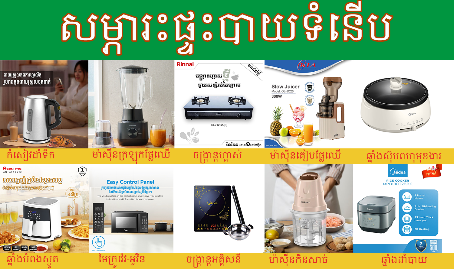 ទំនិញមកដល់ថ្មីNewMidea ឆ្នាំងដាំបាយឌីជីថល បច្ចេកវិទ្យាAI 1.8លីត្រ Rated Voltage 220-240V MRD180T2BDG$65Read moreNew arrivalNewToshiba 20L Microwave Oven MWP-MM20P(BK)Power Supply 220V / 50HzMWP-MM20P(BK)$78Read moreNew arrivalNewMIDEA MICROWAVE MULTI-FUNCTIONS 25L 900W - EG925AXX/SSW486 x H291 x D401 mmEG925AXX$95Read moreទំនិញមកដល់ថ្មីNewMidea ឆ្នាំងដាំបាយឌីជីថល បច្ចេកវិទ្យាAI មុខងារ 6ប្រភេទ 1.8លីត្រការចម្អិន៖ ចម្អិនបាយ, បបរ, សម្លរ, និងចំហុយMRD180B2BDN$45Read moreNewFree: DeliveryTOSHIBA 1.8L Low Sugar IH Rice Cooker RC-18ISRKHW290 x H247 x D367 mmRC-18ISRKH$340Read moreNewFree: DeliveryTOSHIBA 1.8L DIGITAL RICE COOKER Titanium-Coating Composition RC-18NMFKH 5កំប៉ុង680W | Temperature Fuse 152/157C | Warm 30hrsRC-18NMFKH$85Read moreNewFree: DeliveryTOSHIBA 1.0L DIGITAL RICE COOKER Titanium-Coating Composition RC-10NMFKH 3កំប៉ុង560W | Temperature Fuse 152/157C | Warm 30hrsRC-10NMFKH$75Read moreNew arrivalNewOKLA 8.5L Oil-Free Fryer AF-856Set Timer: 1-30mn | 80-200 Degree AF-856$65Read more